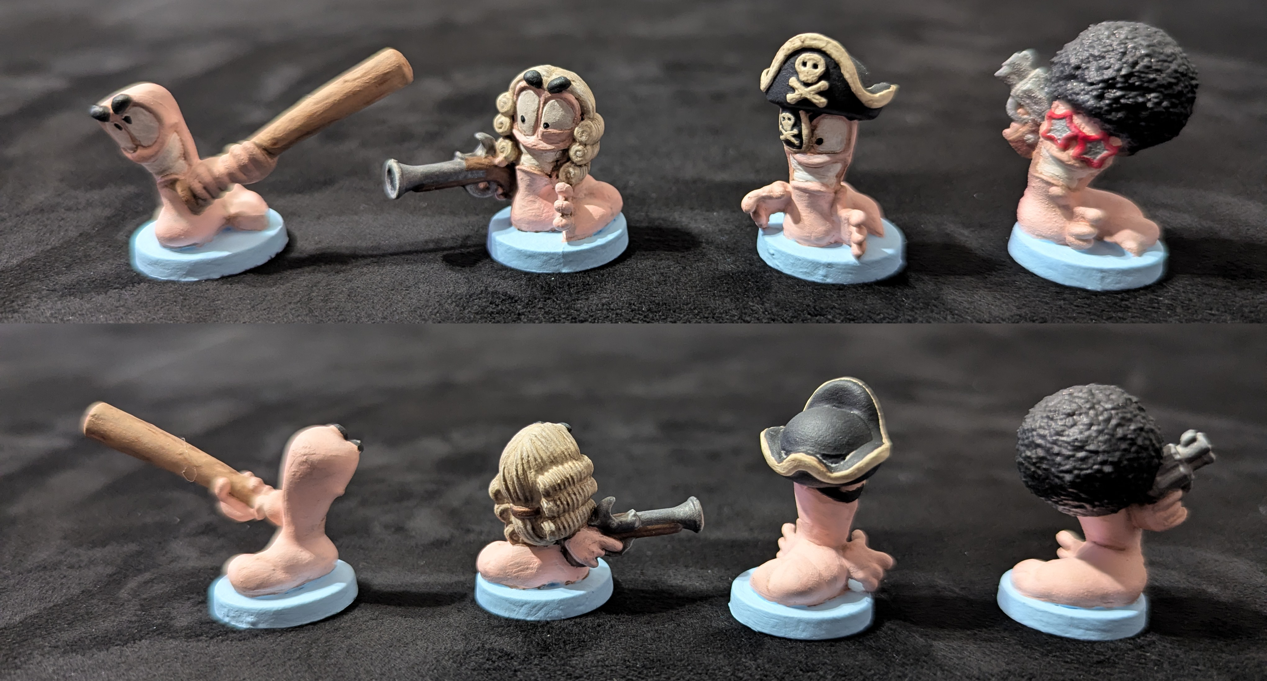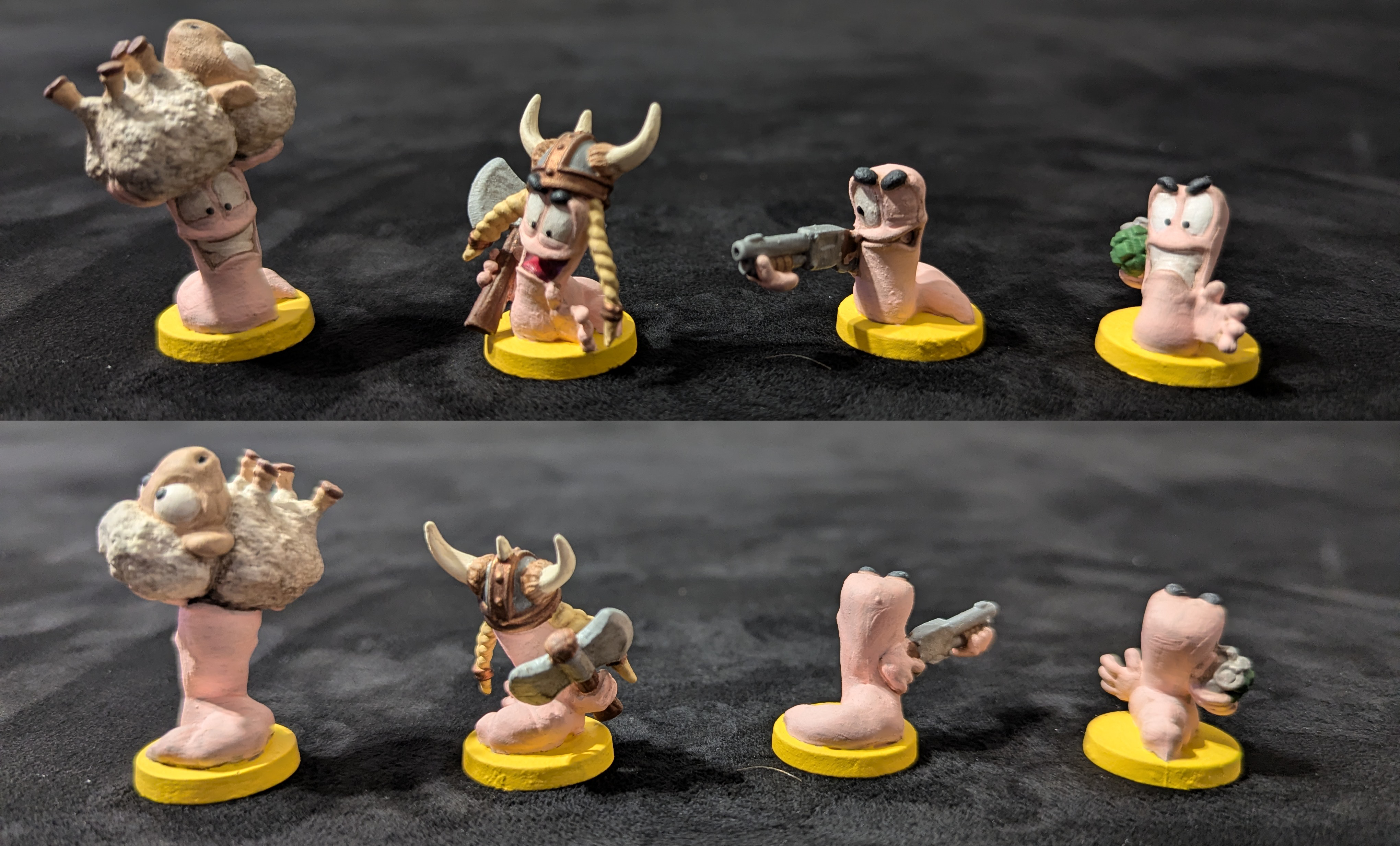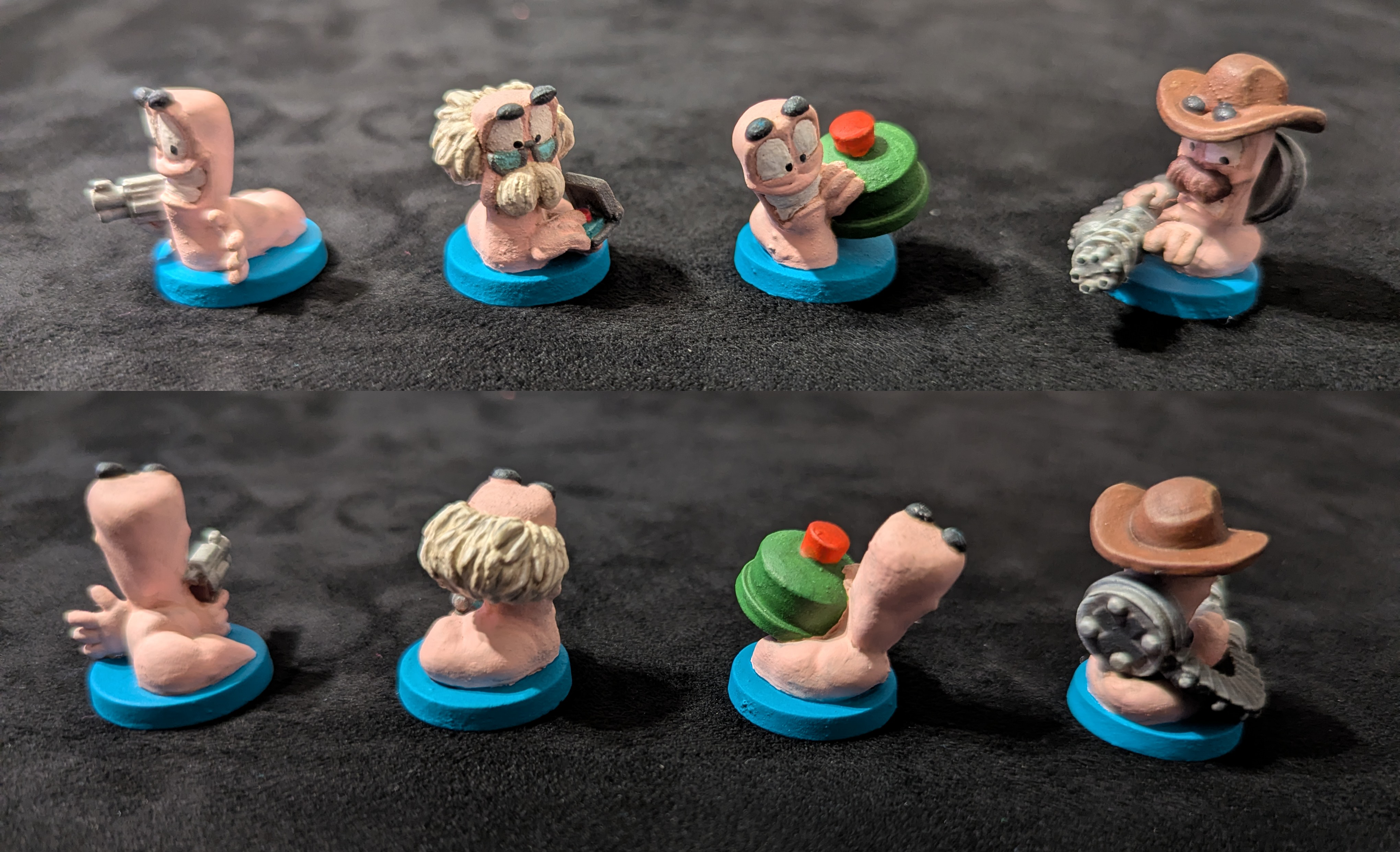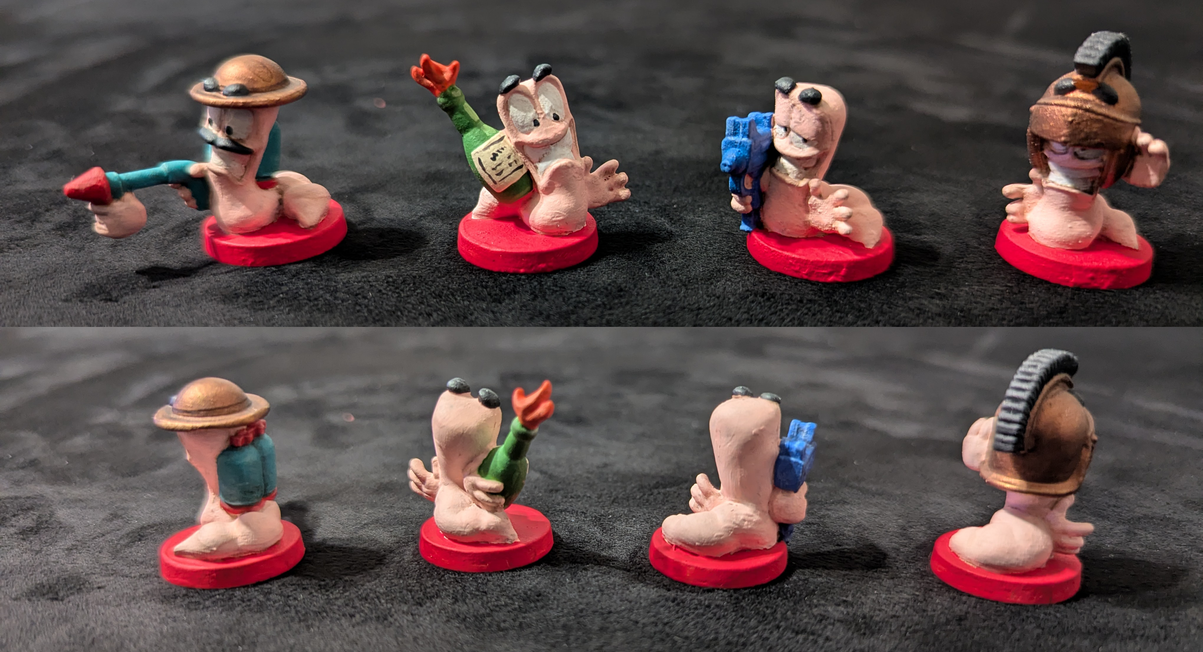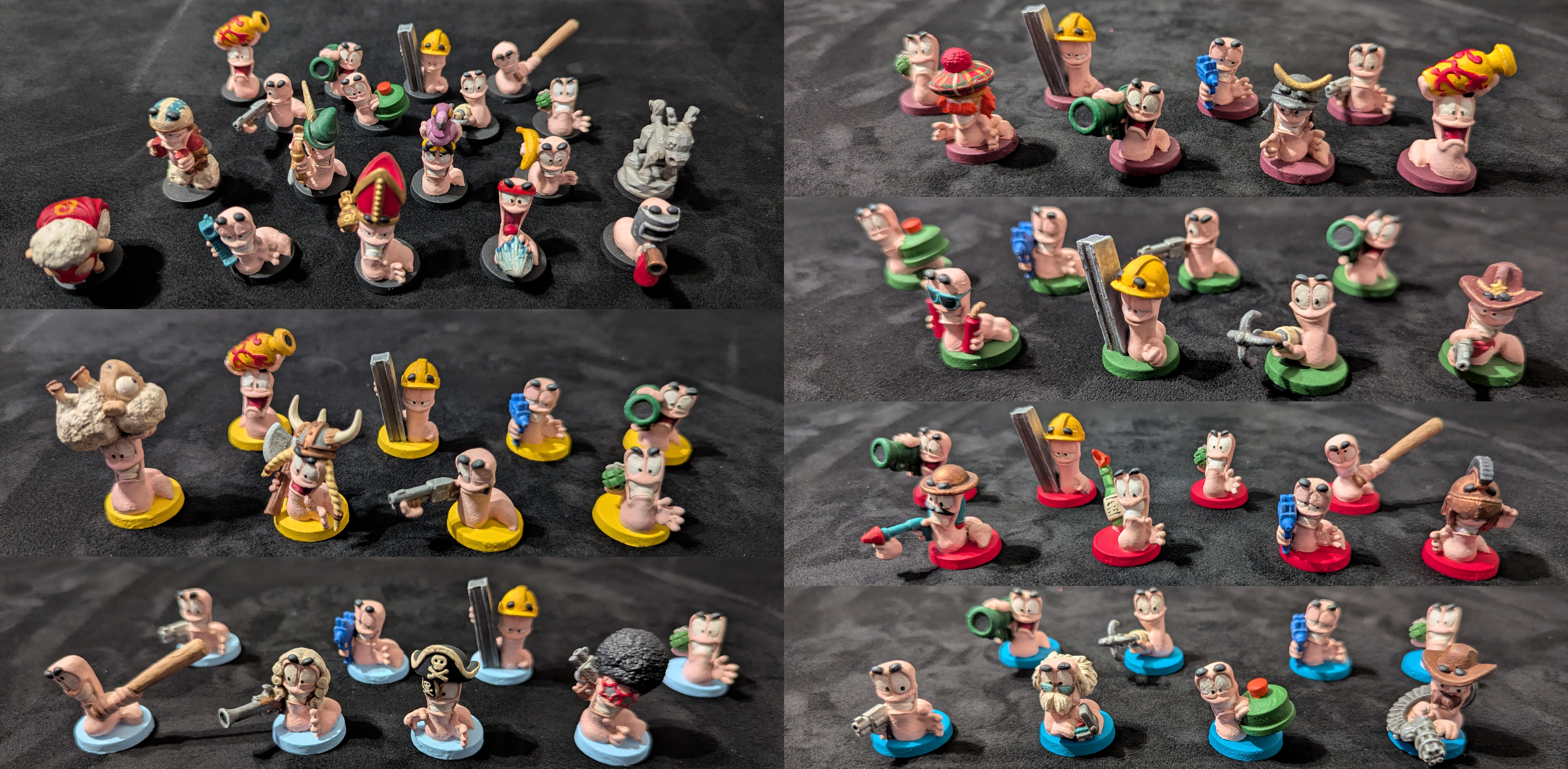 Our team breakdown gives each player 4 primary worms, so you can play 6 teams of 4 worms with no repeated minis on the board. In our teams picture the front 4 are the primary worms and we've marked the bottom of their bases for player convenience. We didn't re-base these minis because their bases denote the teams, black bases are our display worms.